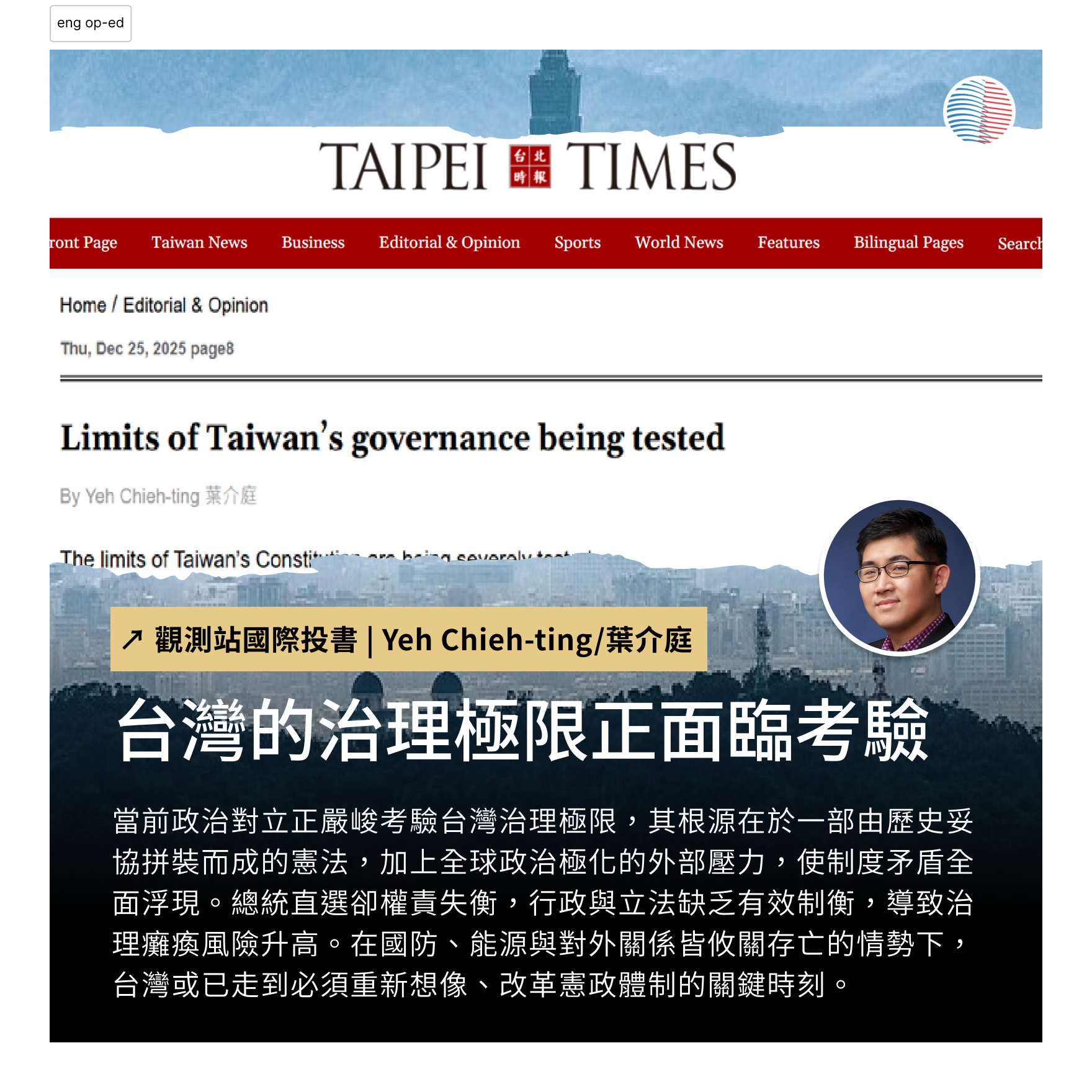 【行憲紀念日反思:當拼裝體制遇上極化政治】 12 月 25 日是行憲紀念日,但台灣社會呈現的卻是對憲政僵局的深層不安。我們正身處一場可能是民主化以來最嚴峻的治理考驗,這不只是朝野政黨的政治攻防,更是那部由歷史妥協「拼裝」而成的憲法,在全球政治極化浪潮下所暴露的結構性疲態。觀測站理事葉介庭投書英文媒體 Taipei Times,試圖對外說明並剖析這場憲政危機的歷史根源與現實代價,以下為全文翻譯。 台灣的治理極限正面臨考驗 當下的政局正在嚴峻地考驗台灣憲法的極限。隨著去年的「青鳥行動」以及今年的大規模罷免潮,顯然有相當數量的選民對於由中國國民黨(KMT)與台灣民眾黨(TPP)所掌控的立法院表示不滿與挫折。 在賴清德總統領導下的民主進步黨(DPP),拒絕隨之起舞,認為在野陣營的所作所為主要旨在不惜一切癱瘓政府。行政院拒絕副署財政收支劃分法的修正案,而立法院則準備發起彈劾賴總統。 這些發展的根源在於兩個因素的交織。首先,台灣今天現行的憲法是由相互矛盾的法律理念與政治妥協所拼湊而成的產物。其次是在全球不確定性中日益加劇的政治兩極化趨勢。 台灣現行的這部憲法於 1947 年實施,並於 1991 年至 2004 年台灣加速民主化期間經歷了七次修憲。它是一個由歐洲內閣制理念、孫文思想以及美國政治運作實務拼湊的產物。 最初的憲法設計中,總統由國民大會代表選出,扮演著虛位「仲裁者」的角色。政府首腦的權力歸於行政院長,且其任命需經立法院同意。但在經歷了蔣介石與其子蔣經國數十年的統治後,總統被視為最高政治權力所在。因此,總統直選成為了 1980 年代與 1990 年代民主運動的目標。 隨著 1996 年總統改為直選,台灣必須面對如何在總統、行政院長與立法院之間劃分權力與責任的問題。經過一系列的政治妥協,體制演變成了今天的模樣。這個拼裝架構是一個漸進過程的結果。每次的修憲,都必須將社會動盪降至最低,並以小步伐尋求共識。換句話說,台灣這種拼湊式的憲政結構,是為了和平過渡到民主所付出的代價——這種過渡雖優於暴力革命,但台灣社會國體仍必須付出成本。 台灣立法、行政與司法部門之間的制衡機制說好聽點是粗糙,說難聽點是殘缺不全。這個體制存在著根本性的矛盾。總統由人民直選產生,擁有治理的民意授權,但只能透過其任命的行政院長來施政。行政院長須對立法院負責,卻無法主動解散立法院。立法院監督行政院長,卻無權決定其任命。 關鍵在於,行政權與立法權之間缺乏有效的否決權或推翻否決的權力機制。 在任何體制中,保留一些解釋空間對於因應未預見情況的靈活性與適用性是必要的,但也為濫權留下了空間。台灣的憲政危機正測試著這個體制的邊緣。 或許雙方政治領袖能找到辦法讓互相有台階下,達成某種暫時的妥協,待日後再戰。然而,這場危機正又剛好發生在全球民主體制因政治極化與局勢動盪而備受考驗之際。全球層面的不穩定與風險代價升高,使得國內敵對陣營的鬥爭也隨之加劇。 台灣的風險代價更是龐大,諸如國防預算、能源來源,以及與美國和中國的經貿關係等議題,每一項都可能引發近乎攸關國家存亡的危機。 那為什麼不修憲?普遍認為,在 2004 年修憲後,修憲門檻被拉得極高(需經公民投票且獲得超過半數選舉人同意)使得修憲幾乎成為不可能的任務。 但那已經是二十多年前的事了。雖然門檻很高,但鑑於當前的風險代價更高,或許是激發台灣政治共同體的想像力,創造一個真正行得通的體制的時候了。 原文: